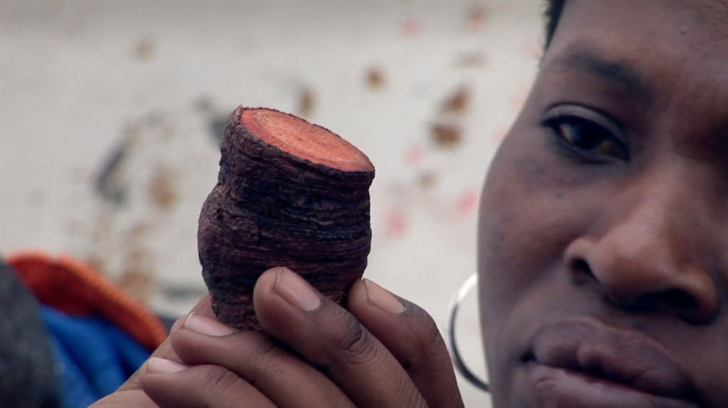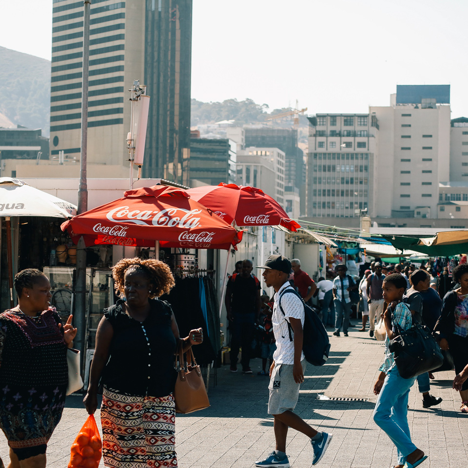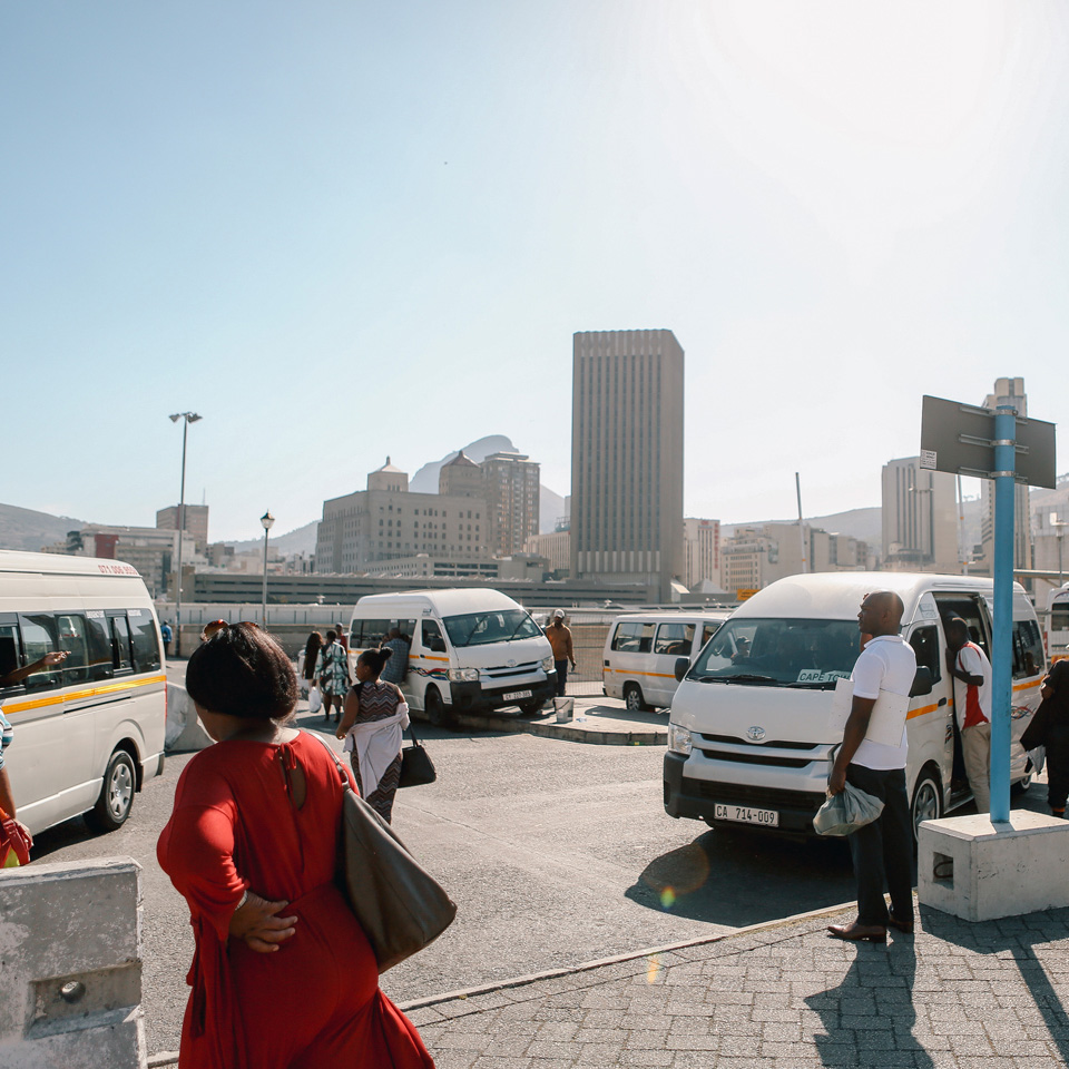 [4b/7]: “In Zuid-Afrika zijn taxistandplaatsen vaak kleine marktjes voor van alles, informatie, of wat je ook nodig zou hebben onderweg naar of van werk. Ik haal er vaak vers fruit of materiaal voor mijn kunst. Maar de standplaatsen kunnen ook gewelddadige plekken zijn. Met geweld dat zich vooral richt op vrouwen. Jonge vrouwen kunnen lastig gevallen of zelfs verkracht worden vanwege hun kleding. Dat moet echt veranderen.”