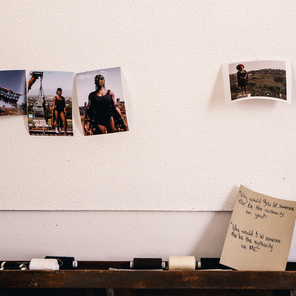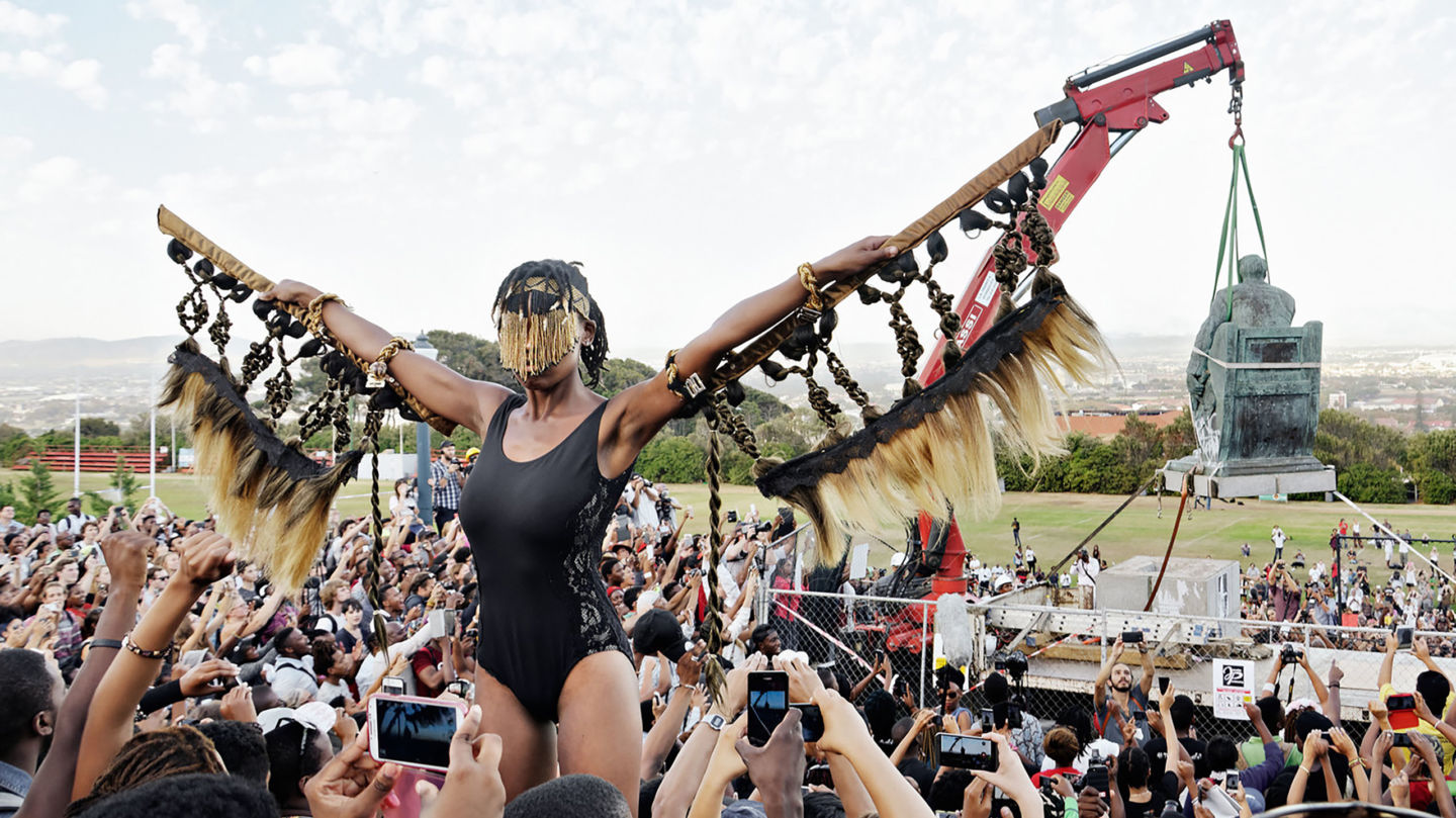 [1b/7]: Een foto van één van haar performances tijdens het sleutelmoment van de studentenbeweging #RhodesMustFall ging in 2015 de wereld rond. We bezochten haar thuis en in haar studio en spraken over een verschillende onderwerpen: van kunst tot de academie, van taxi standplaatsen tot studentenprotesten.