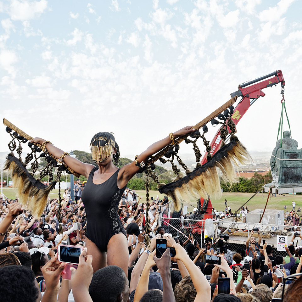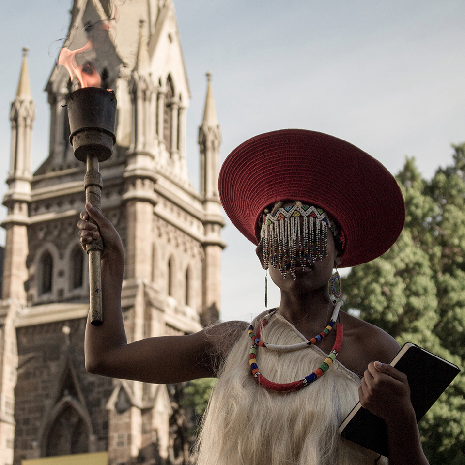 [1a/7]: Sethembile Msezane (1991) is een Zuid-Afrikaanse kunstenaar die in Kaapstad woont en werkt. In haar werk creëert ze krachtige beelden waarin ze reageert op de erfenis van het kolonialisme en het ontbreken van beeltenissen van het zwarte vrouwenlichaam in publieke ruimtes.