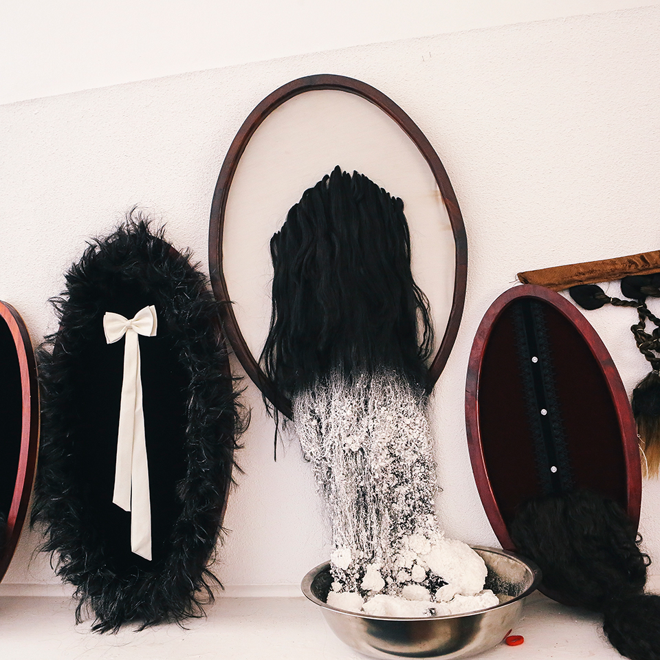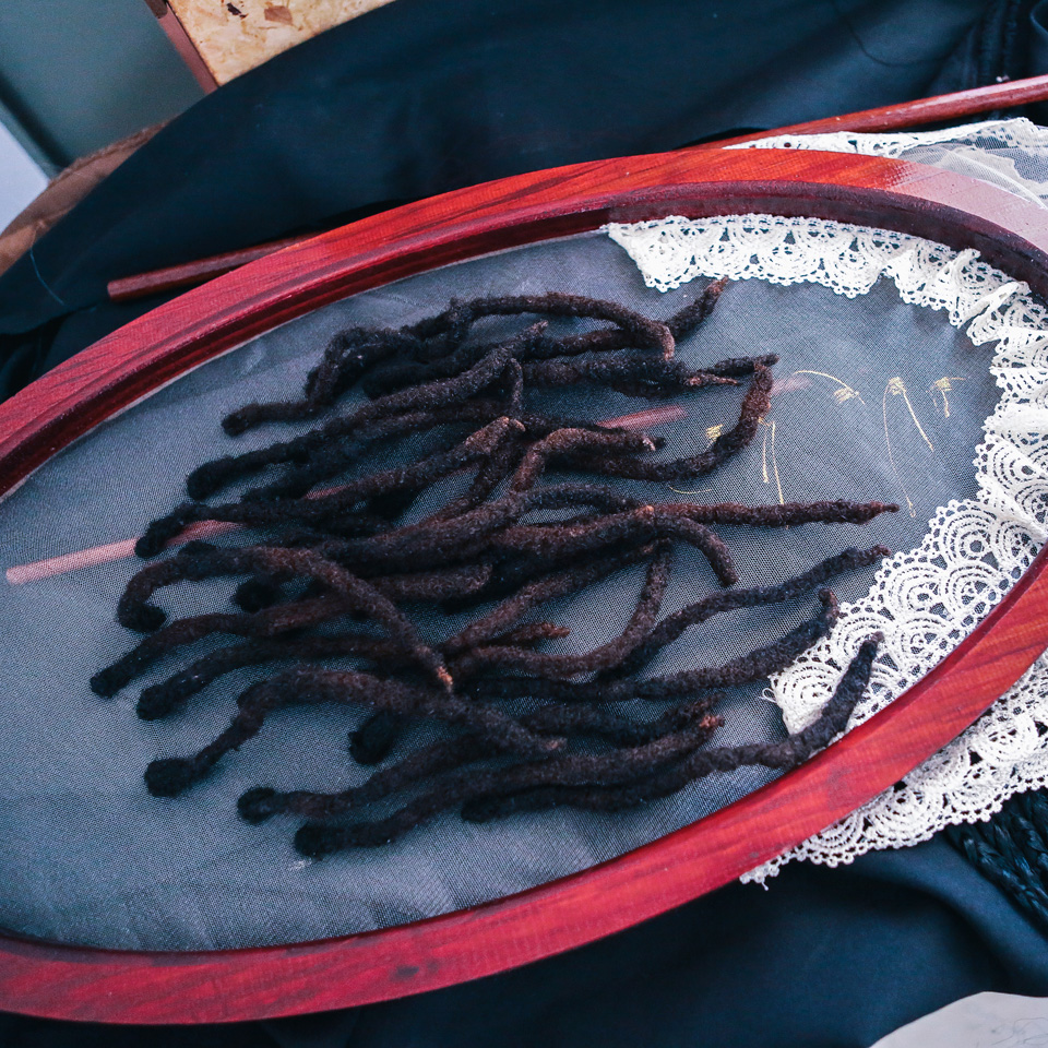 [5a/7]: We bezochten Sethembile’s studio in de kunstacademie op de University of Cape Town om een idee te krijgen van hoe zij te werk gaat. Ze bereidde zich voor op haar eindexamenexpositie en overal lag materiaal: koloniaal antiek en allerlei bundeltjes haar.