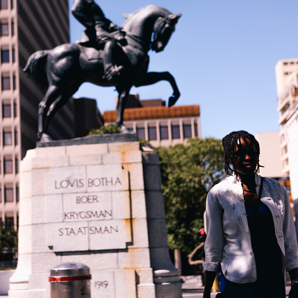 [2b/7]: “Ik wil dat mensen in Zuid-Afrika bewuster omgaan met de symbolen in de publieke ruimte. Het viel me op dat er nauwelijks zwarte vrouwen in voorkomen. Er zijn niet genoeg beeltenissen van heroïsche of succesvolle figuren waar jonge vrouwen een voorbeeld aan kunnen nemen. Ja we hebben onze moeders, maar hoe zien we vrouwen buiten ons eigen huis?“