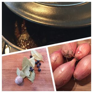 Dan het vlees afdrogen (keukenpapier) en goed bruin braden in boter (ongeveer 10 minuten); daarna afblussen met de marinade en de sjalotten.