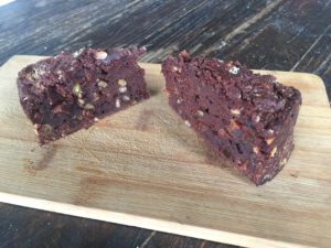 Vet een rechthoekige schaal in van een grootte dat de taart 3-4 cm hoog wordt. Hij rijst niet. Voordat je de schaal vult met beslag, bestrooi de boter met cacao en broodkruimels.