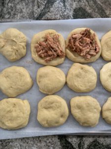 Zet een bakplaat met ingevet bakpapier klaar. Rol een deegballetje uit tot een diameter van 12 cm en schep een afgestreken eetlepel van het kipmengsel in het midden.