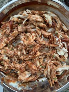 Haal de gare filet uit het water, leg hem op een bord tot hij genoeg afgekoeld is om aan te pakken en pluk hem met twee vorken uit elkaar. Voeg nu de barbe- cuesaus, mayo, chilivlokken en bieslook toe en meng de smaakmakers er goed door. Dek de vulling af en zet in de koelkast.