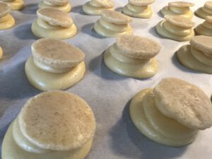 4) Soezendeeg maken, soezen opspuiten en craquelin erop, in oven afbakken, 20-25 minuten