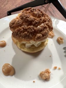 Krokante soes met vulling van gezouten karamelslagroom met krokante amandel en karamelsaus, gebaseerd op een recept van Alan Geaam