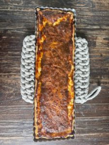 Vermeng alle bovengenoemde ingrediënten (ook de nogwarm gefruite uiten) met het lamsvlees, met uitzondering van de abrikozen en de laurierbladeren. Spreid het gekruide vlees uit in een met boter ingesmeerde hoge ovenschotel. Stop dan pas de abrikozen en de laurierbladeren in de vleeskoek. Laat het vlees anderhalf uur lang in een matig hete oven (180 graden Celsius) gaar worden, maar giet er na één uur een roe overheen, gemaakt van: 1 ei, 1/2 kop melk en de geraspte of fijngesneden schil van een hele citroen.