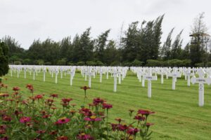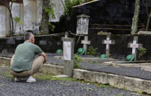 We filmen in Semarang ook op de erebegraafplaats Kalibanteng. Ik verwacht daar de graven aan te treffen van ‘beide meisjes’: Winnie en Frieda Flohr. Maar er zijn geen grafstenen, voor niemand van de apothekersfamilie Flohr. Wel is er een gezamenlijke grafsteen voor een drietal Nederlanders die naar verluidt ook in de apotheek zijn vermoord. Zij werkten voor de RAPWI (Recovery of Allied Prisoners of War and Internees) die bij het einde van de Tweede Wereldoorlog in Azië door de geallieerden was opgezet. RAPWI-medewerkers waren soms het doelwit van Indonesische revolutionairen die alles wantrouwden wat westers was.
