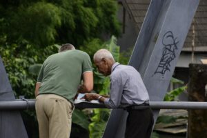De volgende brug, over de Semarangrivier, was destijds deel van de demarcatielijn. Nederlanders op de oostelijke oever, de stadkant; Indonesiërs op de westoever. Priyanto vertelt over de onderhandelingen die hier zijn gevoerd door kolonel Van Langen, de grootvader van Hans, en zijn Indonesische tegenspeler kolonel Soenarto. Die maakte voor de oorlog deel uit van het KNIL. Van een Nederlandse veteraan hoorden we eerder dat Van Langen eigenlijk niet wilde praten met Soenarto. De man mocht dan nu wel kolonel in het Indonesische leger zijn, in het KNIL stond hij veel lager in rang.