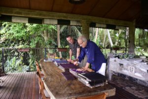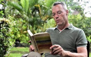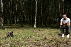 Hans zit op een passende locatie en leest een boek. Vaak is er een shot waarin je de omslag van dat boek ziet. Zoals bij Rubber. Op de kleine rubberplantage waar we filmden was er de rust en de ruimte om dat te doen. In de montagekamer komt editor Jouke Dubel vervolgens met een prima idee: hij laat de citaten letterlijk in beeld verschijnen. Niet als ‘gewone’ titels onderin, maar heel opvallend midden in beeld. Dat ziet er bij Rubber mooi uit en hopelijk gaat dat bij alle boeken goed werken.