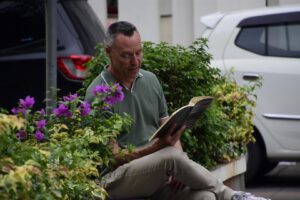 De laatste brug ligt midden in de stad. Veel groen, bloemen en zitjes. Hans leest uit de bundel Wisseling van de wacht. Die bevat een tiental verhalen van Indonesiërs over de Japanse bezetting en de periode daar vlak na. Nh. Dini schrijft over haar leven in Semarang. Over stapels lijken in de rivier, over moordpartijen en ontvoeringen – ze kan het als jong meisje nauwelijks bevatten, want ‘het leven ging gewoon en rustig verder’. Een klassiek beeld van een land in oorlog.