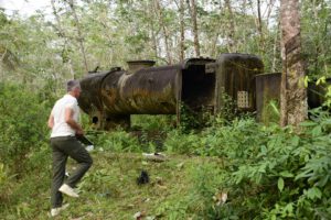 Op onze rit naar hier volgen we min of meer de beruchte Pakan Baroe spoorlijn. Ooit bedacht om kolen van de Ombilinmijn in Sawahlunto naar Pekanbaru te transporteren. Een klein deel van de spoorlijn is aangelegd door het Indische gouvernement, de Japanners starten in 1943 het werk opnieuw op. Met Indonesiërs, de romusha's, en westerse krijgsgevangenen die onder dwang en in erbarmelijke omstandigheden moesten werken. De spoorlijn is nooit in gebruik gekomen. Nu staat er bij het stadje Lipat Kain alleen nog een roestige locomotief, in de buurt van wat ooit werkkamp nummer 7 was.