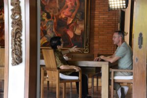 De foto’s zijn bekend: knalgroene rijstvelden omzoomd door palmen; natuurschoon. Het valt me tegen als we hier deze middag landen. Toegegeven, het weer zit niet mee. Grijze luchten, het regenseizoen is nu echt begonnen. Gisterenavond in Semarang waren vele straten in rivieren veranderd. Maar het meest teleurstellende vind ik het verkeer. Alweer die stromen auto’s en brommers, alweer de eindeloze files. Niks rust. Het is zo’n 30 kilometer van het vliegveld naar het hotel, we doen er ruim anderhalf uur over.