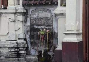 Eenmaal op wat kleinere wegen valt me één ding direct op: kleine altaartjes met offerandes van wat fruit en bloemen - overal waar je kijkt. Ik associeer het met de kleine kapelletjes die ik ken uit Limburg, maar dat wordt niet gedeeld door Hans en cameraman Jackó. Zij zijn eerder op Bali geweest. Halverwege onze rit is het donker. Misschien krijg ik morgenochtend wonderschoon Bali te zien. Met bloemen zoals ik ze gisteren op Java zag.