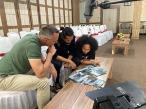 Aan de wanden veel foto’s. Tegen die achtergrond maken de bezoekers selfies en foto’s van elkaar. Iedereen doet dat hier veelvuldig, jong én oud. Wij wachten op de grote groep scholieren die wordt verwacht. Het duurt en het duurt – een van hun bussen blijkt pech te hebben, door een misverstand belanden ze eerst nog bij het Nederlandse fort, afijn, het wordt na de lunch.