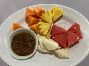 In het visrestaurant word ik geconfronteerd met een ander gebruik van hier: het toetje komt als eerste op tafel. Althans – voor mij is een schaal met gemengd fruit een toetje. Atik zegt dat het heel gezond is om de maaltijd met fruit te beginnen. Zoet, zout, bitter – smaken komen hier in voor mij ongewone combinaties en volgordes voorbij. Soms is het verrassend lekker, maar watermeloen met satésaus, ik weet het niet.