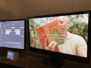 Mooie herinneringen, maar boeken brengen hun eigen problemen mee. Want hoe breng je een boek in beeld? De meeste boeken hebben een vorm die niet goed samengaat met het breedbeeld van de televisie. En hoe maak je duidelijk dat wat je hoort aan tekst een citaat is? Daar zijn aanhalingstekens voor bedacht, maar voor geluid bestaan die niet. Inmiddels zijn de eerste montageweken achter de rug. En hebben we het ‘probleem’ vooralsnog opgelost.